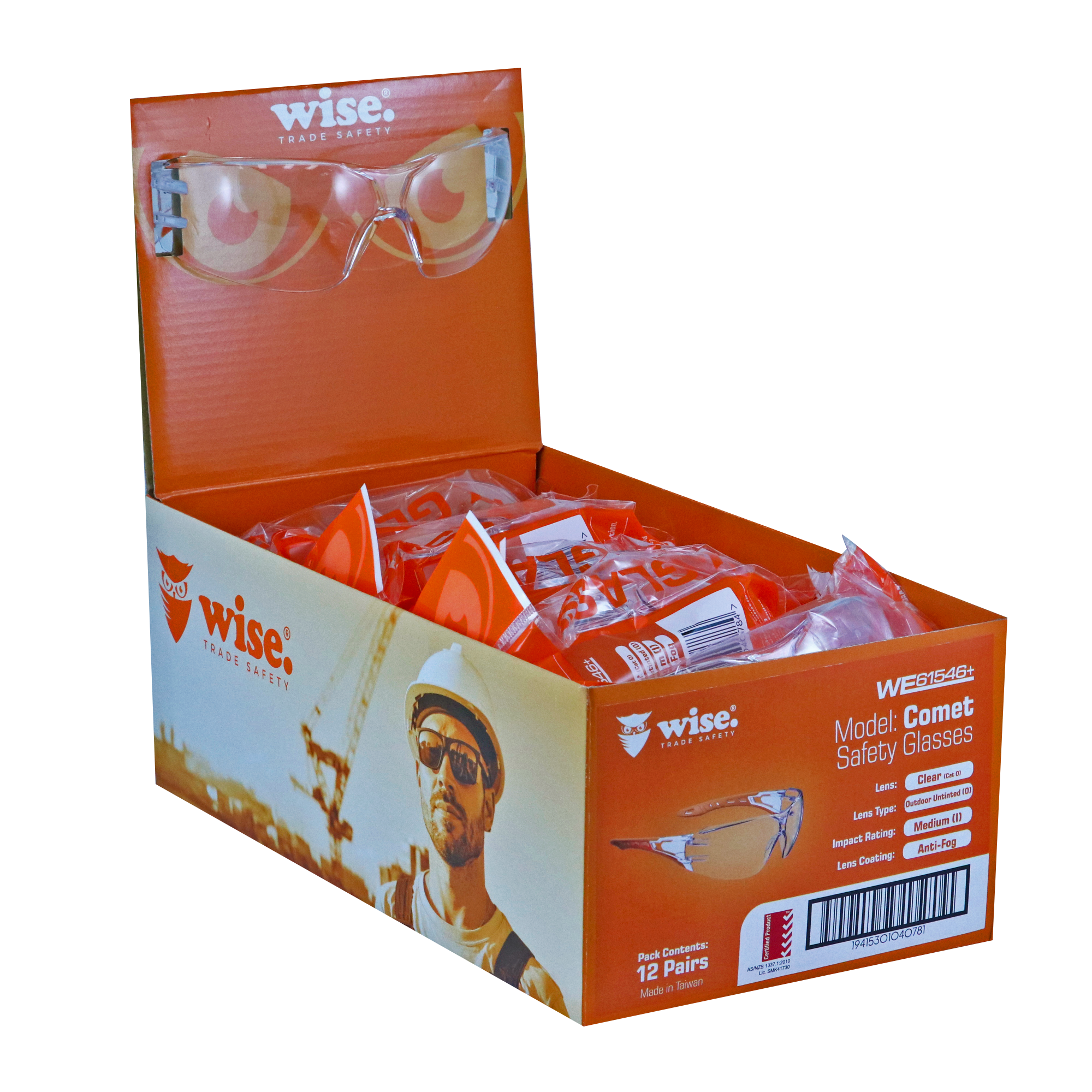 The Wise Comet Clear Safety Glasses deliver reliable protection with enhanced comfort. Featuring a Cat 0 clear lens and anti-fog coating, they maintain clarity in both indoor and outdoor environments. With padded side arms and a lightweight build, they’re perfect for all-day wear on the job.