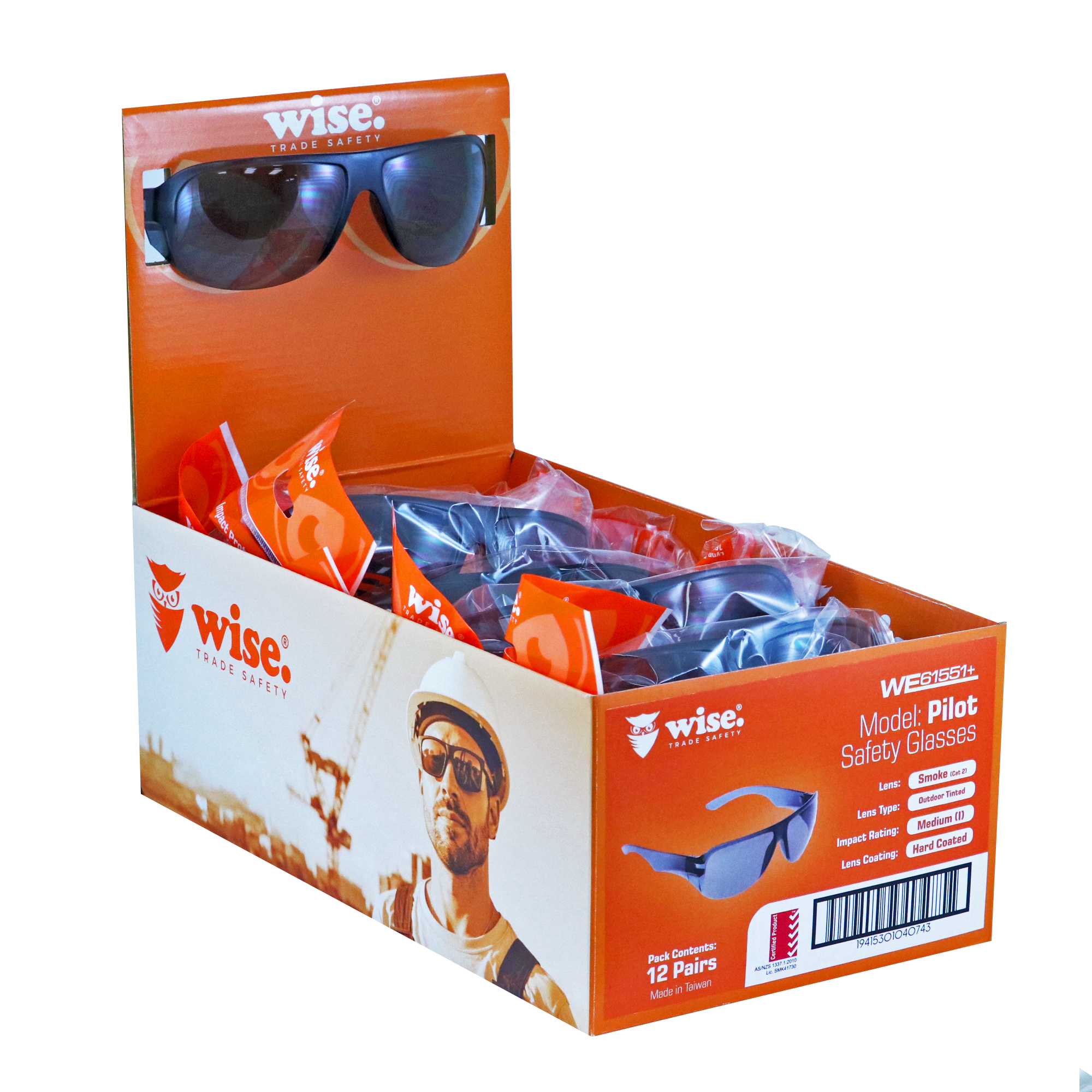 The Wise Pilot Smoke Safety Glasses deliver a balance of style and dependable protection. With a smoke-tinted Cat 2 lens, they’re ideal for reducing glare in outdoor environments. Featuring a rubberized black frame with logo detailing, they combine durability, comfort, and a modern look.