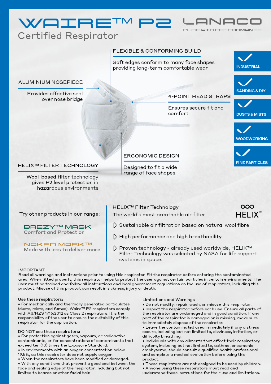 The WAIRE™ P2 respirator mask must be fitted and adjusted correctly to your face to provide the intended protection. (4 x Single-use masks)